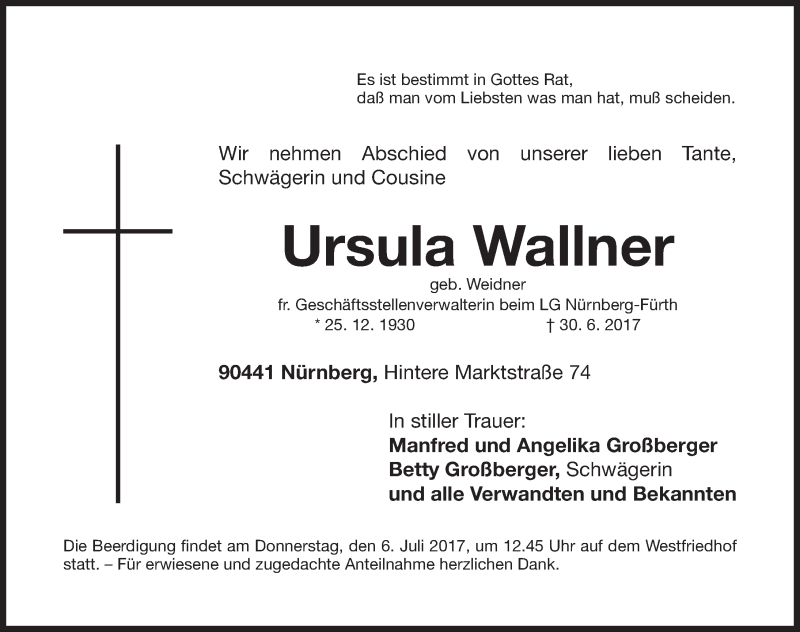 Hier finden Sie alle Traueranzeigen aus der Zeitung, die bisher für Ursula Wallner erschienen sind. Weitere Traueranzeigen, die in der Zeitung erscheinen, werden hier ebenfalls aufgelistet