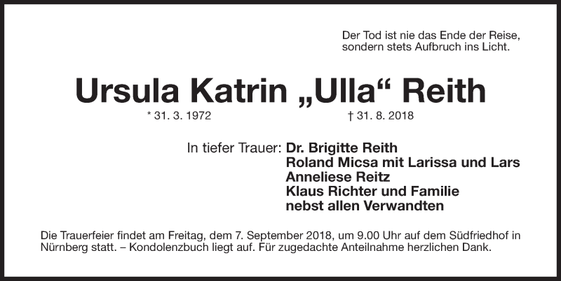 Hier finden Sie alle Traueranzeigen aus der Zeitung, die bisher für Ursula Katrin Reith erschienen sind. Weitere Traueranzeigen, die in der Zeitung erscheinen, werden hier ebenfalls aufgelistet