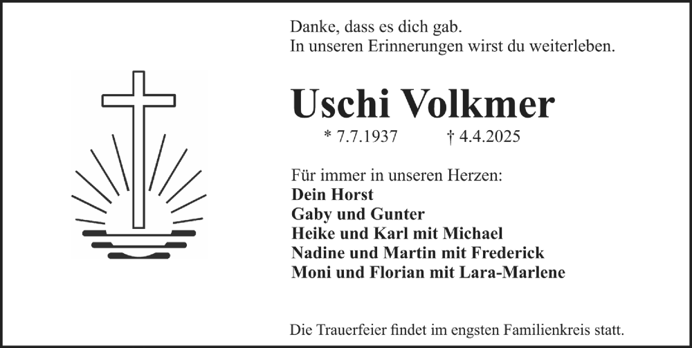 Hier finden Sie alle Traueranzeigen aus der Zeitung, die bisher für Uschi Volkmer erschienen sind. Weitere Traueranzeigen, die in der Zeitung erscheinen, werden hier ebenfalls aufgelistet