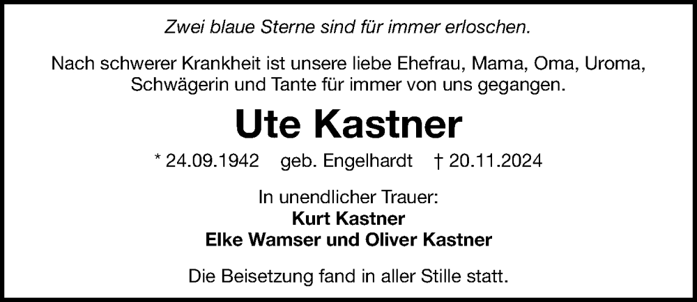 Hier finden Sie alle Traueranzeigen aus der Zeitung, die bisher für Ute Kastner erschienen sind. Weitere Traueranzeigen, die in der Zeitung erscheinen, werden hier ebenfalls aufgelistet