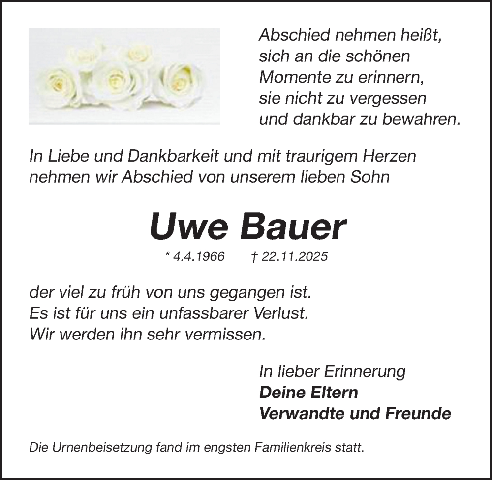 Hier finden Sie alle Traueranzeigen aus der Zeitung, die bisher für Uwe Bauer erschienen sind. Weitere Traueranzeigen, die in der Zeitung erscheinen, werden hier ebenfalls aufgelistet