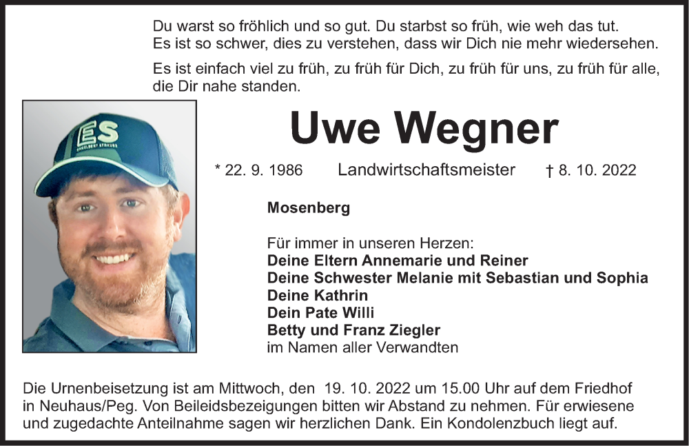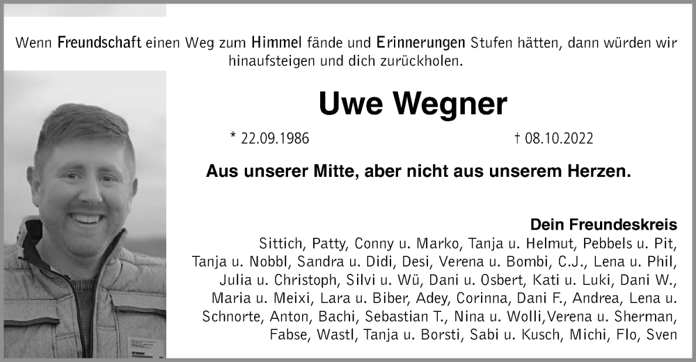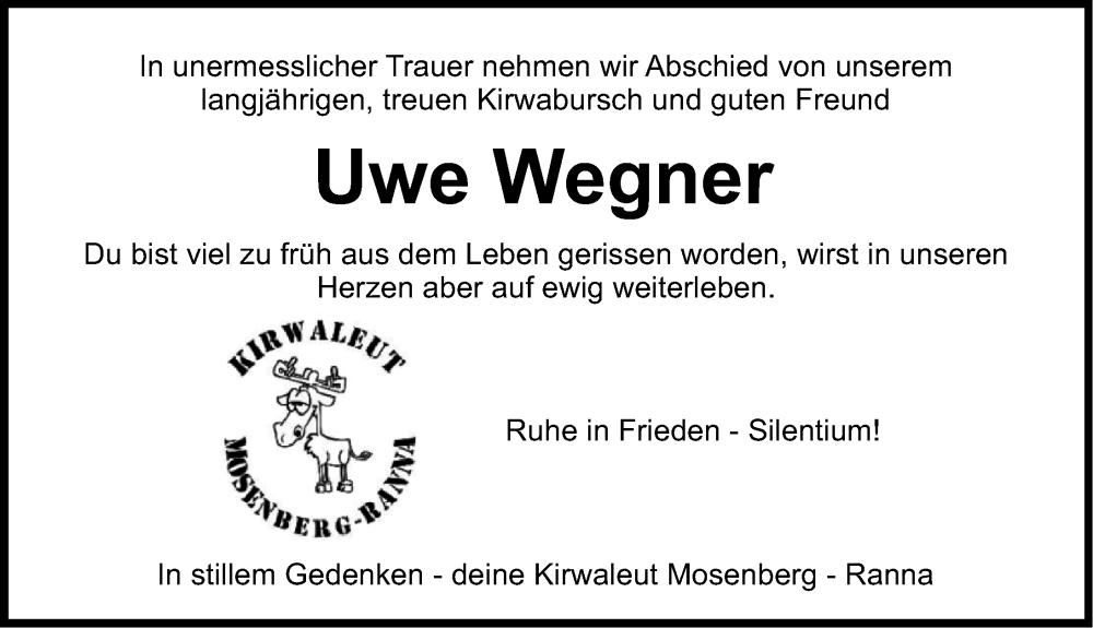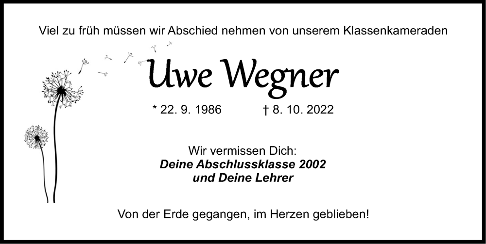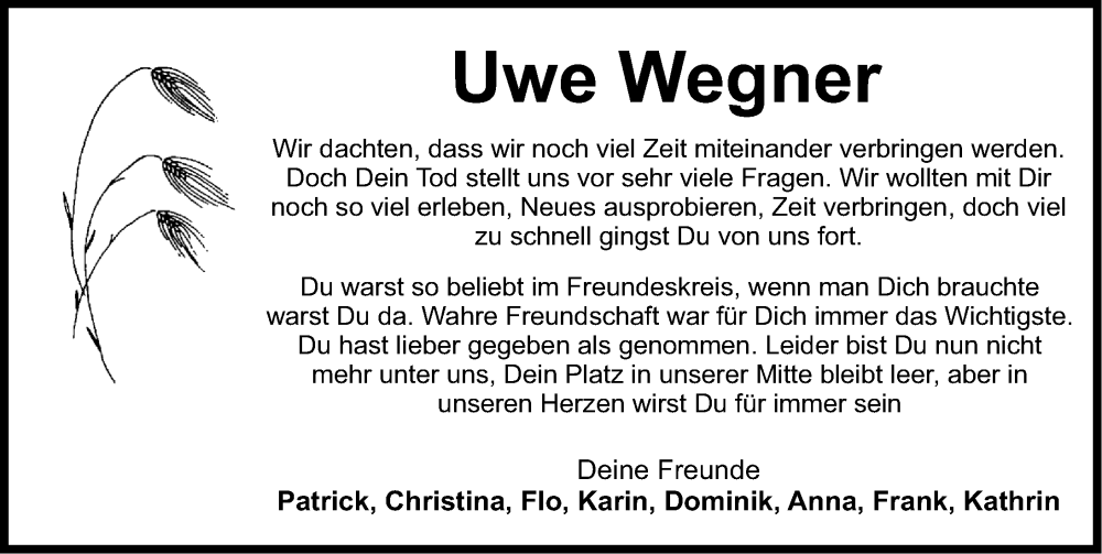 Hier finden Sie alle Traueranzeigen aus der Zeitung, die bisher für Uwe Wegner erschienen sind. Weitere Traueranzeigen, die in der Zeitung erscheinen, werden hier ebenfalls aufgelistet
