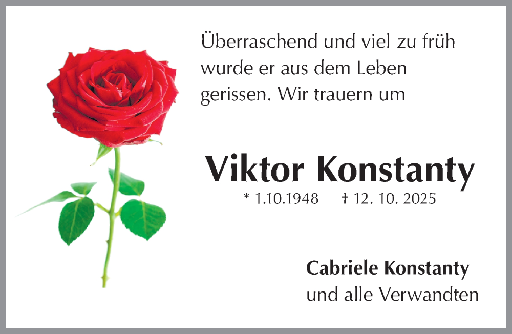 Hier finden Sie alle Traueranzeigen aus der Zeitung, die bisher für Viktor Konstanty erschienen sind. Weitere Traueranzeigen, die in der Zeitung erscheinen, werden hier ebenfalls aufgelistet