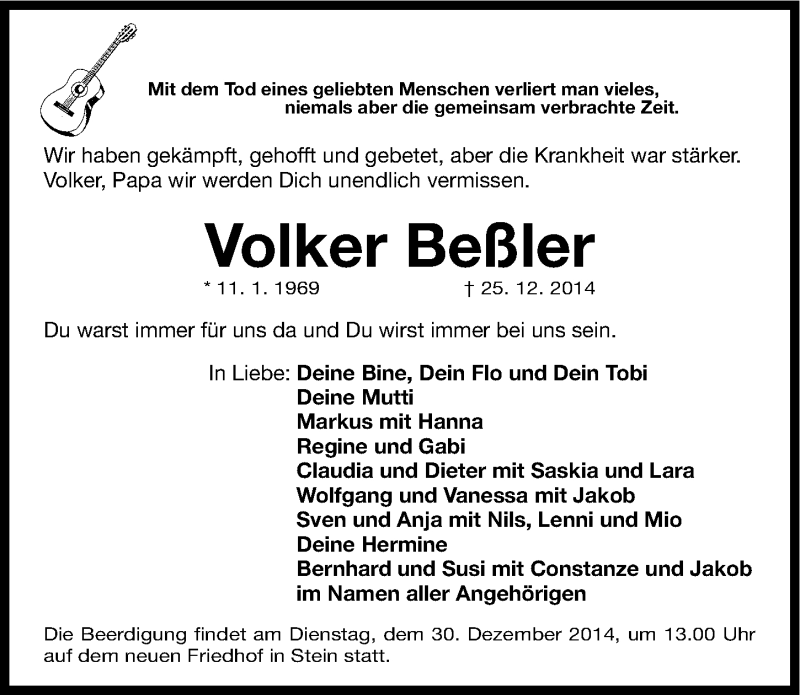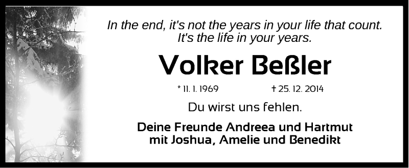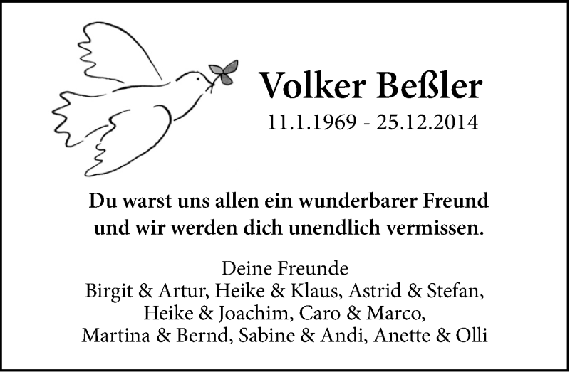 Hier finden Sie alle Traueranzeigen aus der Zeitung, die bisher für Volker Beßler erschienen sind. Weitere Traueranzeigen, die in der Zeitung erscheinen, werden hier ebenfalls aufgelistet