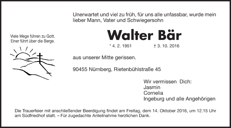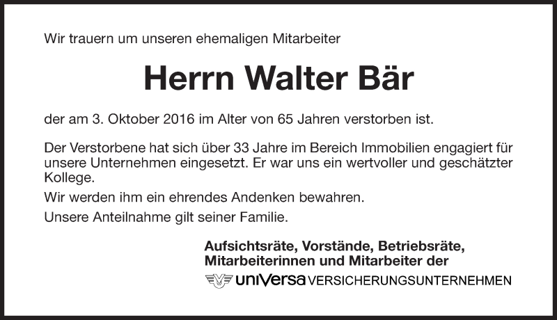Hier finden Sie alle Traueranzeigen aus der Zeitung, die bisher für Walter Bär erschienen sind. Weitere Traueranzeigen, die in der Zeitung erscheinen, werden hier ebenfalls aufgelistet