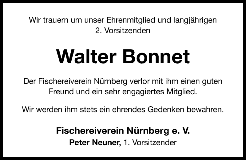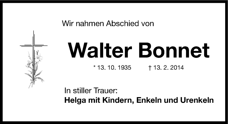 Hier finden Sie alle Traueranzeigen aus der Zeitung, die bisher für Walter Bonnet erschienen sind. Weitere Traueranzeigen, die in der Zeitung erscheinen, werden hier ebenfalls aufgelistet