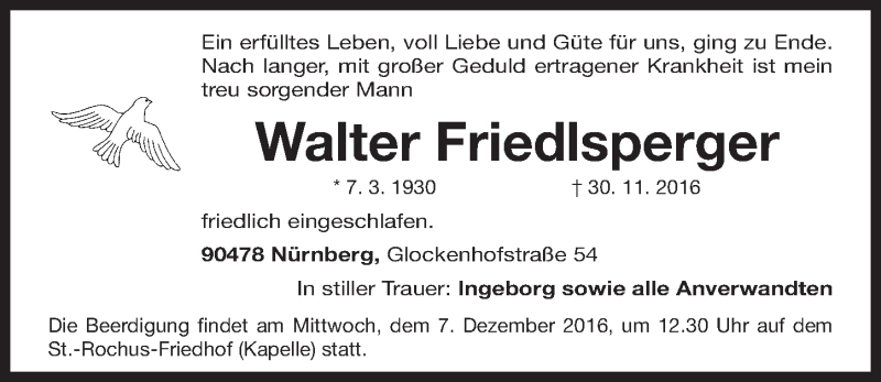 Hier finden Sie alle Traueranzeigen aus der Zeitung, die bisher für Walter Friedlsperger erschienen sind. Weitere Traueranzeigen, die in der Zeitung erscheinen, werden hier ebenfalls aufgelistet