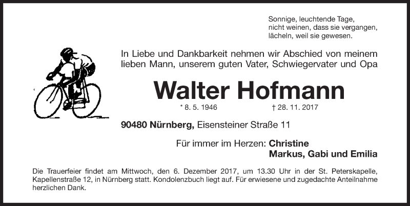 Hier finden Sie alle Traueranzeigen aus der Zeitung, die bisher für Walter Hofmann erschienen sind. Weitere Traueranzeigen, die in der Zeitung erscheinen, werden hier ebenfalls aufgelistet