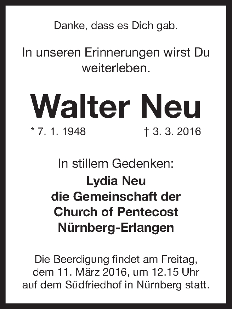 Hier finden Sie alle Traueranzeigen aus der Zeitung, die bisher für Walter Neu erschienen sind. Weitere Traueranzeigen, die in der Zeitung erscheinen, werden hier ebenfalls aufgelistet