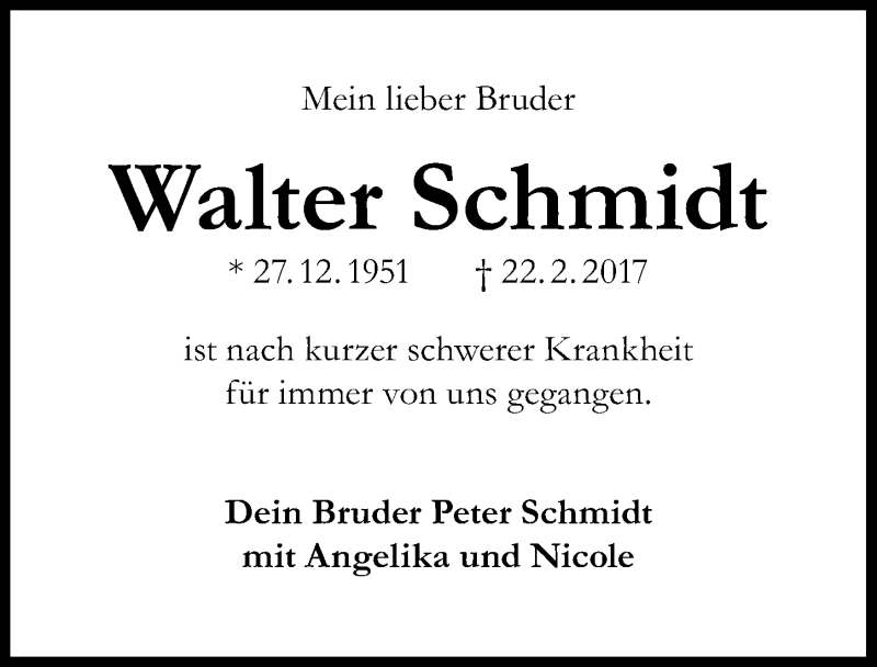 Hier finden Sie alle Traueranzeigen aus der Zeitung, die bisher für Walter Schmidt erschienen sind. Weitere Traueranzeigen, die in der Zeitung erscheinen, werden hier ebenfalls aufgelistet