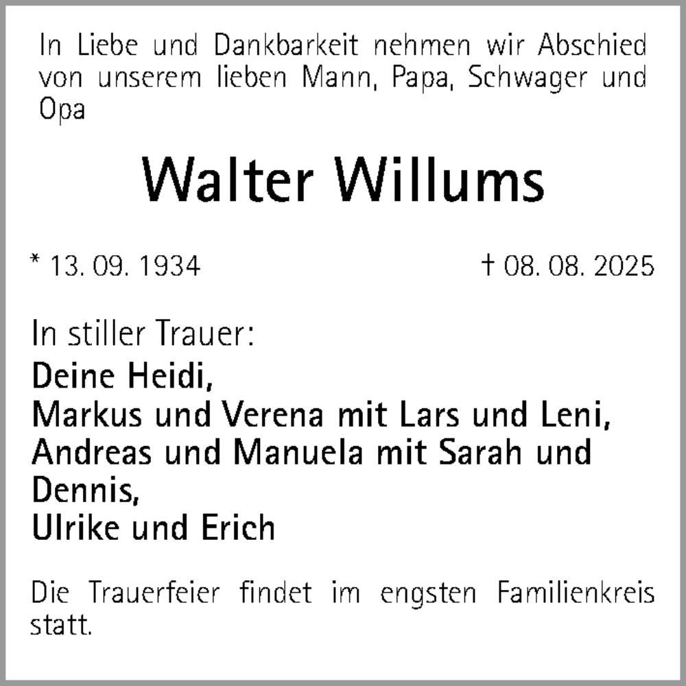 Hier finden Sie alle Traueranzeigen aus der Zeitung, die bisher für Walter Willums erschienen sind. Weitere Traueranzeigen, die in der Zeitung erscheinen, werden hier ebenfalls aufgelistet