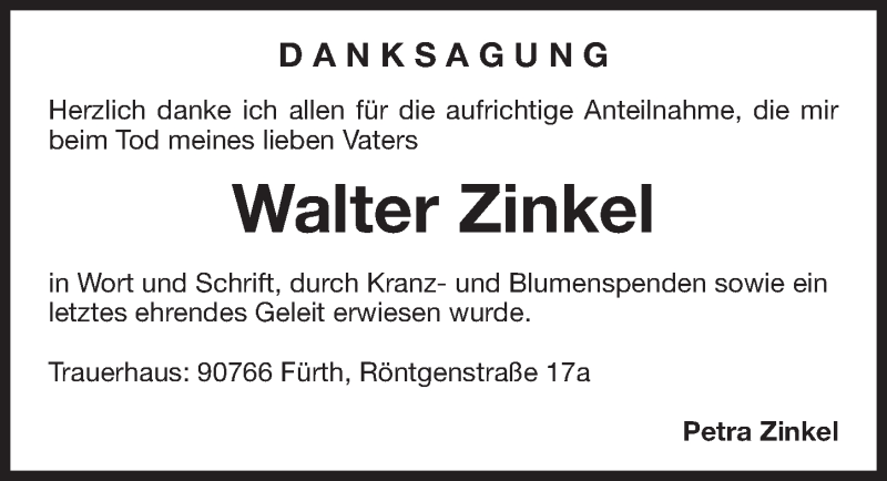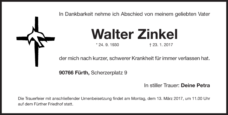 Hier finden Sie alle Traueranzeigen aus der Zeitung, die bisher für Walter Zinkel erschienen sind. Weitere Traueranzeigen, die in der Zeitung erscheinen, werden hier ebenfalls aufgelistet