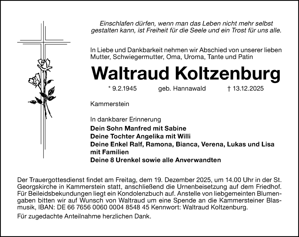 Hier finden Sie alle Traueranzeigen aus der Zeitung, die bisher für Waltraud Koltzenburg erschienen sind. Weitere Traueranzeigen, die in der Zeitung erscheinen, werden hier ebenfalls aufgelistet