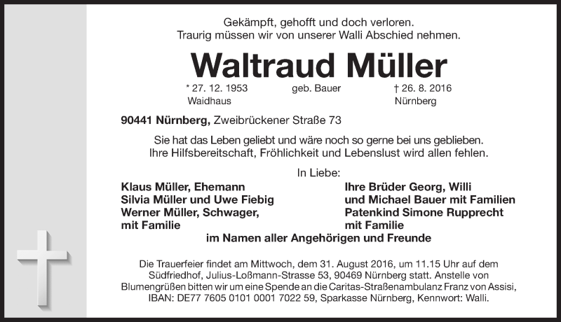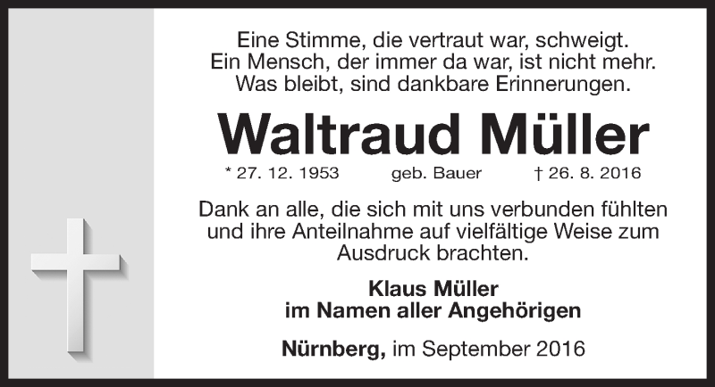 Hier finden Sie alle Traueranzeigen aus der Zeitung, die bisher für Waltraud Müller erschienen sind. Weitere Traueranzeigen, die in der Zeitung erscheinen, werden hier ebenfalls aufgelistet
