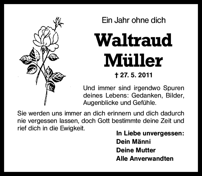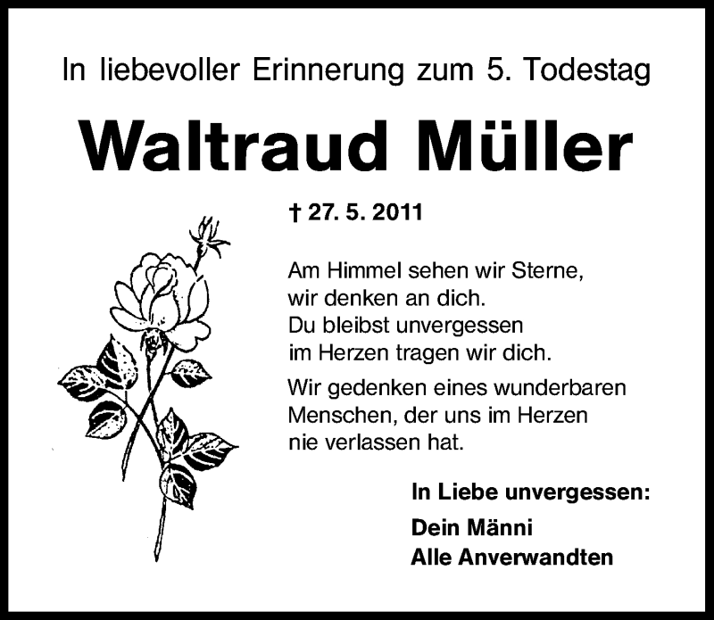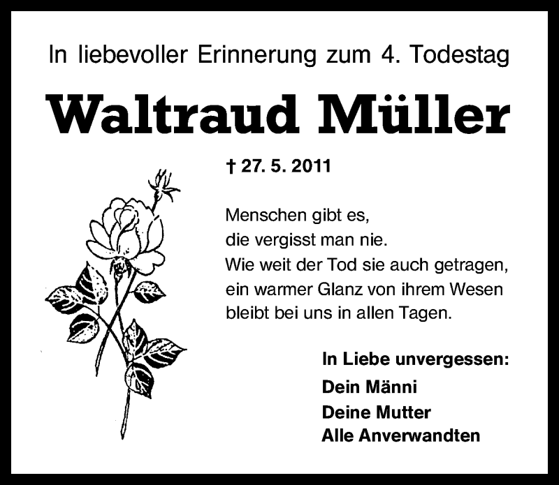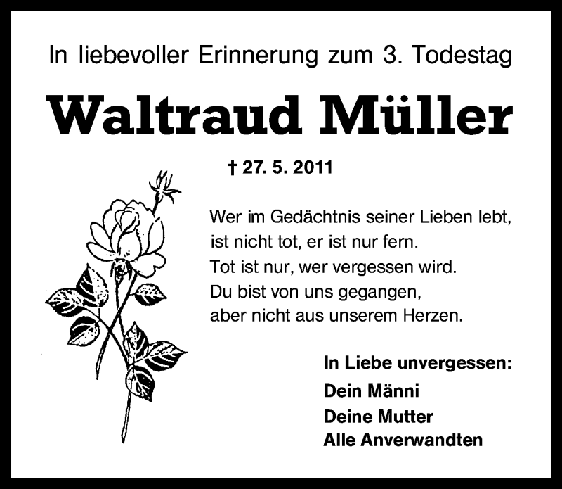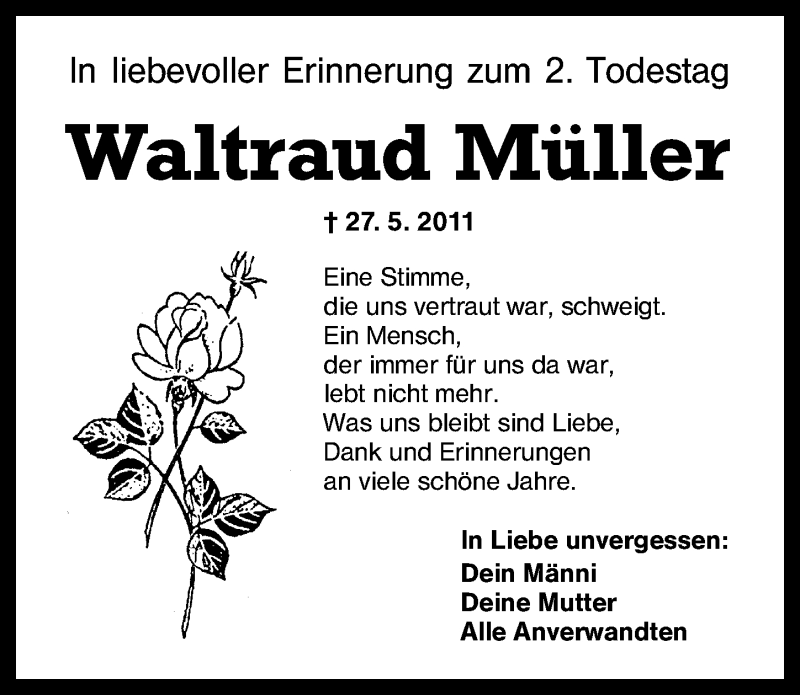 Hier finden Sie alle Traueranzeigen aus der Zeitung, die bisher für Waltraud Müller erschienen sind. Weitere Traueranzeigen, die in der Zeitung erscheinen, werden hier ebenfalls aufgelistet