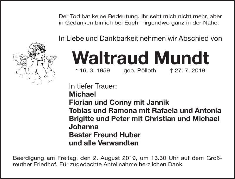 Hier finden Sie alle Traueranzeigen aus der Zeitung, die bisher für Waltraud Mundt erschienen sind. Weitere Traueranzeigen, die in der Zeitung erscheinen, werden hier ebenfalls aufgelistet
