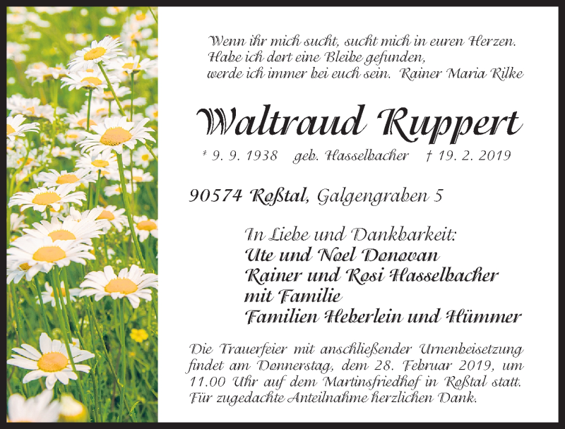 Hier finden Sie alle Traueranzeigen aus der Zeitung, die bisher für Waltraud Ruppert erschienen sind. Weitere Traueranzeigen, die in der Zeitung erscheinen, werden hier ebenfalls aufgelistet