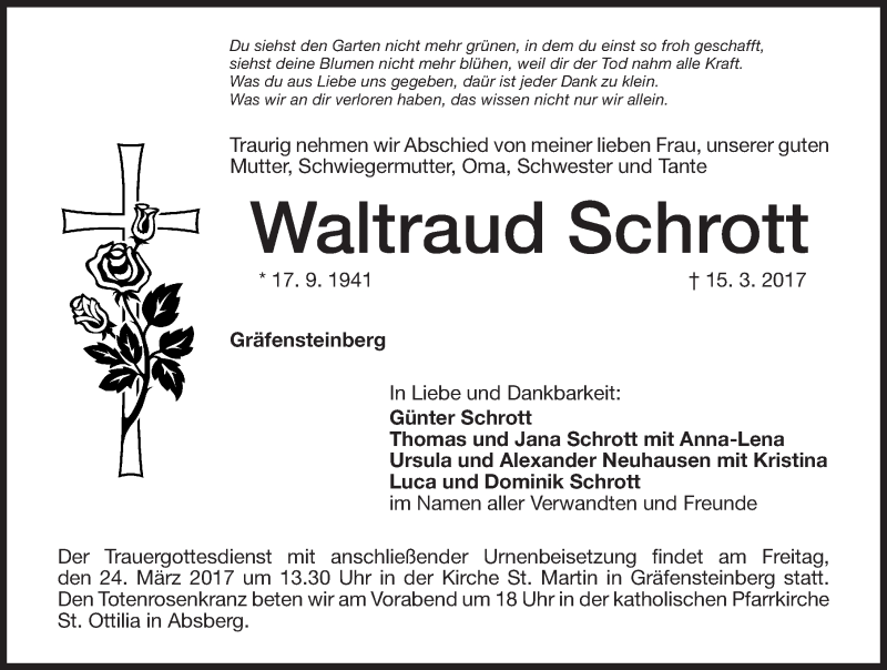 Hier finden Sie alle Traueranzeigen aus der Zeitung, die bisher für Waltraud Schrott erschienen sind. Weitere Traueranzeigen, die in der Zeitung erscheinen, werden hier ebenfalls aufgelistet