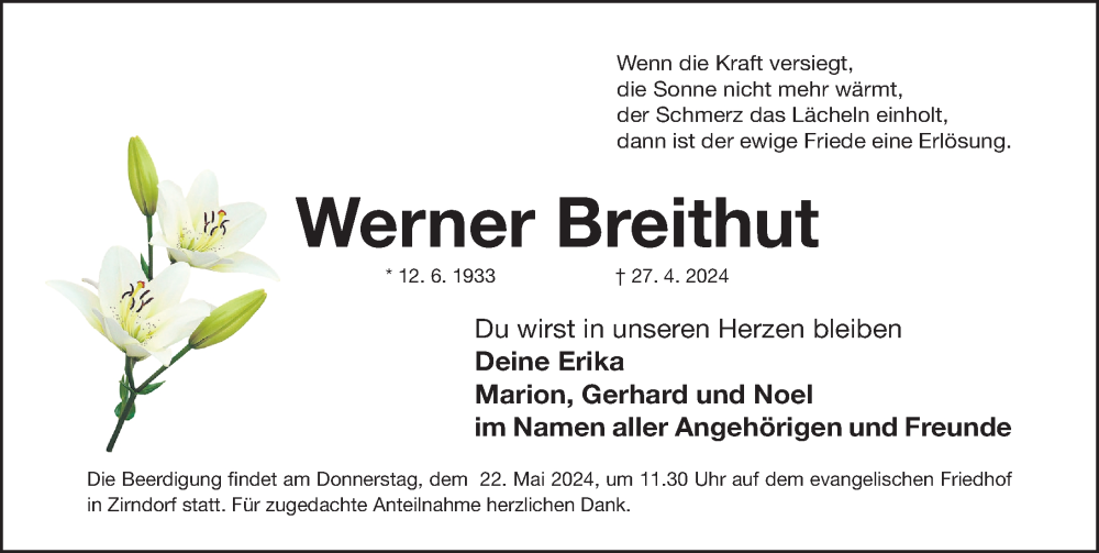 Hier finden Sie alle Traueranzeigen aus der Zeitung, die bisher für Werner Breithut erschienen sind. Weitere Traueranzeigen, die in der Zeitung erscheinen, werden hier ebenfalls aufgelistet