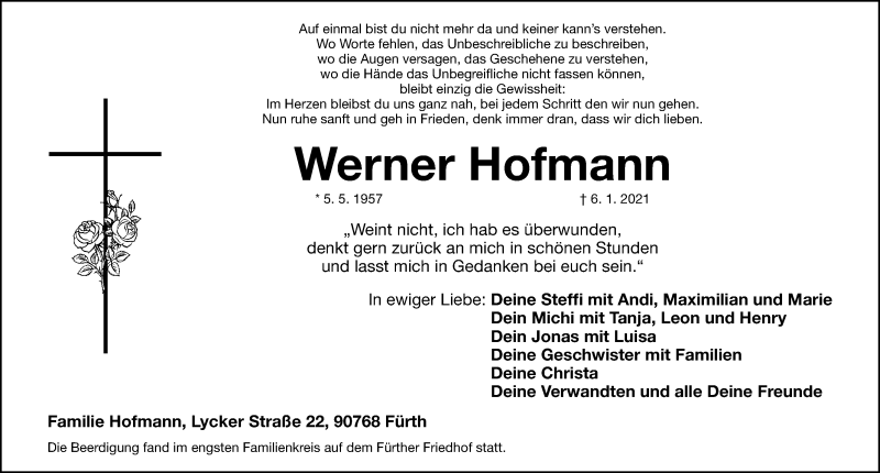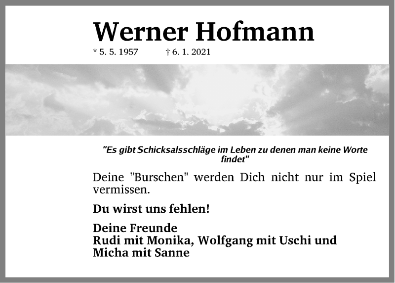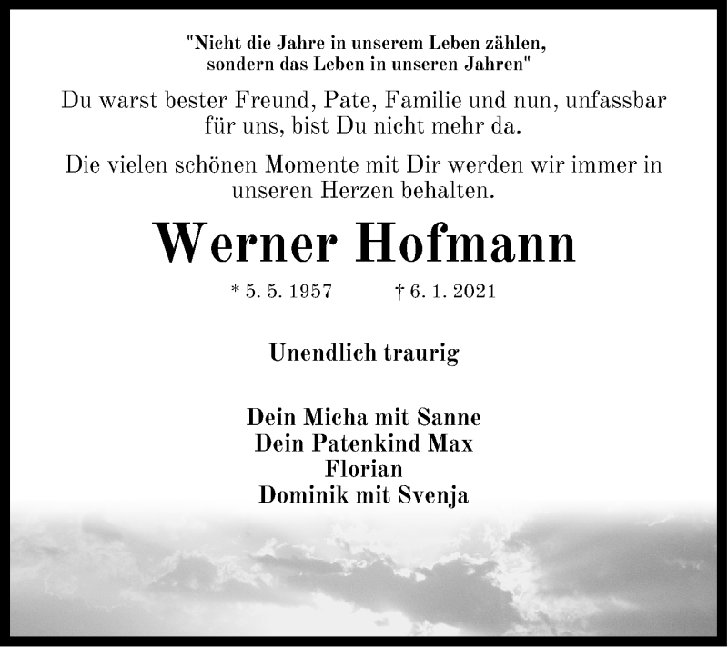 Hier finden Sie alle Traueranzeigen aus der Zeitung, die bisher für Werner Hofmann erschienen sind. Weitere Traueranzeigen, die in der Zeitung erscheinen, werden hier ebenfalls aufgelistet