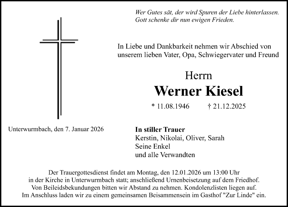 Hier finden Sie alle Traueranzeigen aus der Zeitung, die bisher für Werner Kiesel erschienen sind. Weitere Traueranzeigen, die in der Zeitung erscheinen, werden hier ebenfalls aufgelistet