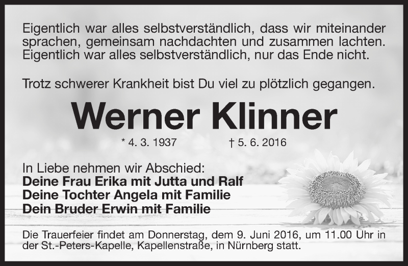 Hier finden Sie alle Traueranzeigen aus der Zeitung, die bisher für Werner Klinner erschienen sind. Weitere Traueranzeigen, die in der Zeitung erscheinen, werden hier ebenfalls aufgelistet
