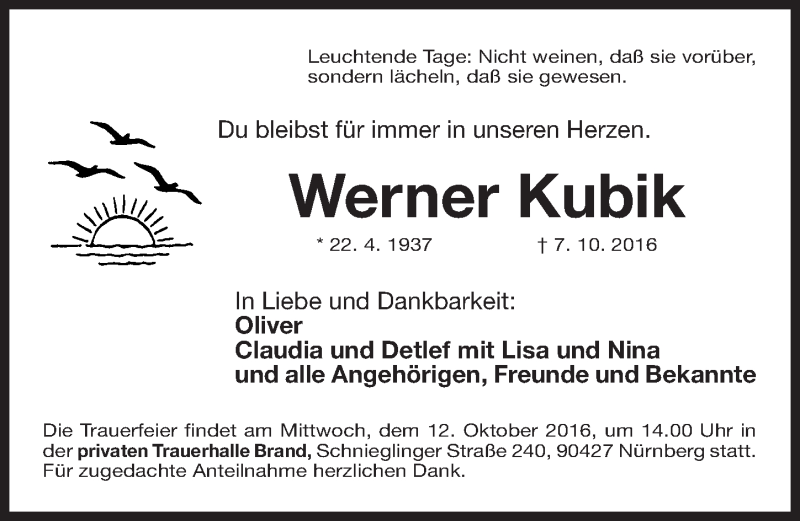 Hier finden Sie alle Traueranzeigen aus der Zeitung, die bisher für Werner Kubik erschienen sind. Weitere Traueranzeigen, die in der Zeitung erscheinen, werden hier ebenfalls aufgelistet