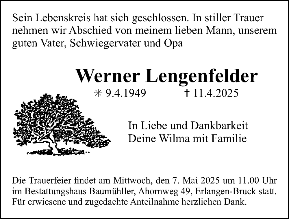 Hier finden Sie alle Traueranzeigen aus der Zeitung, die bisher für Werner Lengenfelder erschienen sind. Weitere Traueranzeigen, die in der Zeitung erscheinen, werden hier ebenfalls aufgelistet