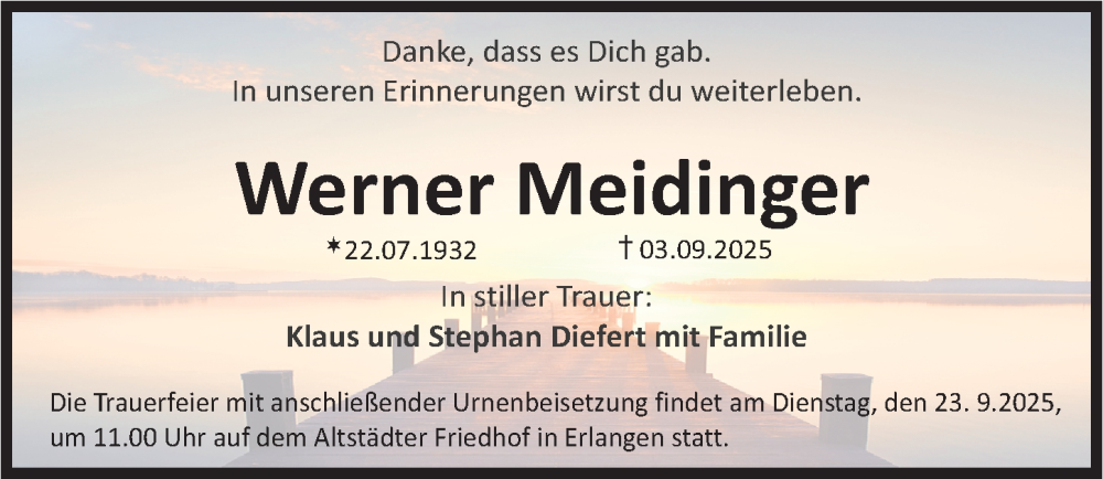 Hier finden Sie alle Traueranzeigen aus der Zeitung, die bisher für Werner Meidinger erschienen sind. Weitere Traueranzeigen, die in der Zeitung erscheinen, werden hier ebenfalls aufgelistet