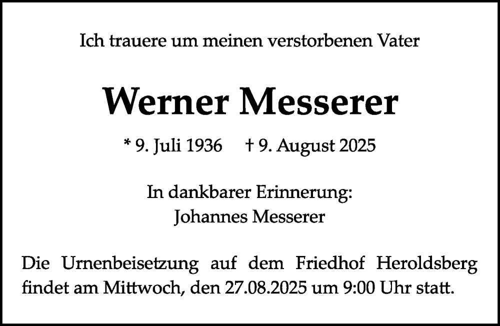 Hier finden Sie alle Traueranzeigen aus der Zeitung, die bisher für Werner Messerer erschienen sind. Weitere Traueranzeigen, die in der Zeitung erscheinen, werden hier ebenfalls aufgelistet
