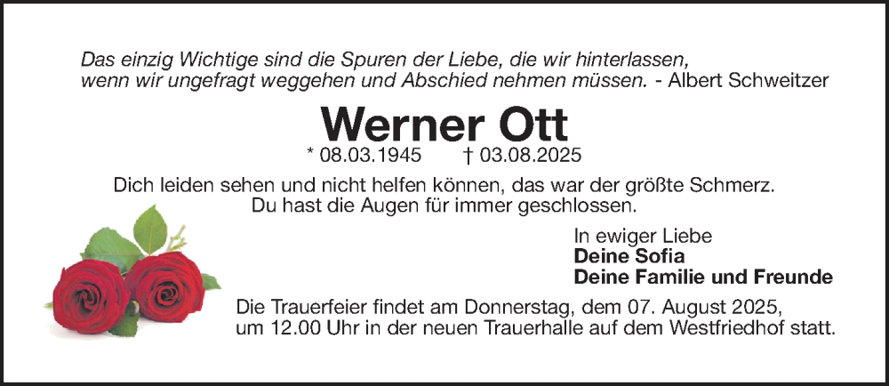 Hier finden Sie alle Traueranzeigen aus der Zeitung, die bisher für Werner Ott erschienen sind. Weitere Traueranzeigen, die in der Zeitung erscheinen, werden hier ebenfalls aufgelistet