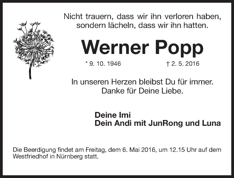 Hier finden Sie alle Traueranzeigen aus der Zeitung, die bisher für Werner Popp erschienen sind. Weitere Traueranzeigen, die in der Zeitung erscheinen, werden hier ebenfalls aufgelistet