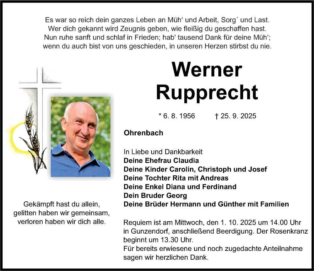 Hier finden Sie alle Traueranzeigen aus der Zeitung, die bisher für Werner Rupprecht erschienen sind. Weitere Traueranzeigen, die in der Zeitung erscheinen, werden hier ebenfalls aufgelistet
