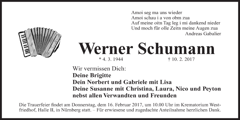 Hier finden Sie alle Traueranzeigen aus der Zeitung, die bisher für Werner Schumann erschienen sind. Weitere Traueranzeigen, die in der Zeitung erscheinen, werden hier ebenfalls aufgelistet