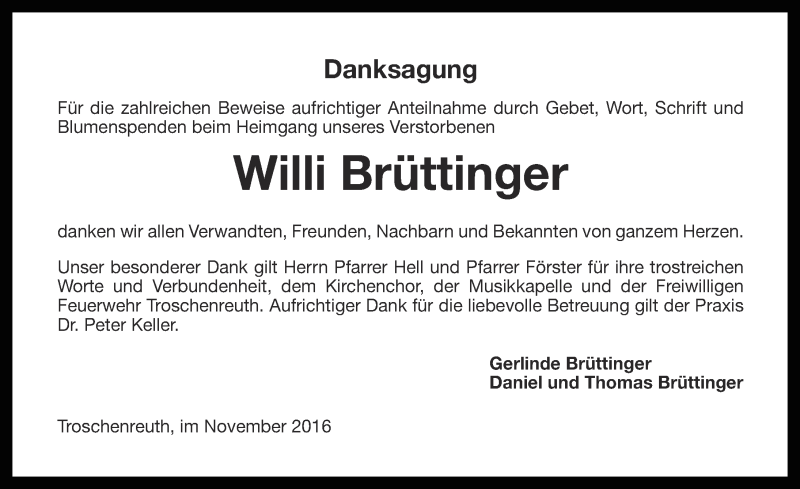 Hier finden Sie alle Traueranzeigen aus der Zeitung, die bisher für Willi Brüttinger erschienen sind. Weitere Traueranzeigen, die in der Zeitung erscheinen, werden hier ebenfalls aufgelistet
