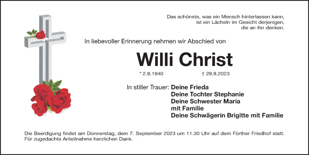 Hier finden Sie alle Traueranzeigen aus der Zeitung, die bisher für Willi Christ erschienen sind. Weitere Traueranzeigen, die in der Zeitung erscheinen, werden hier ebenfalls aufgelistet