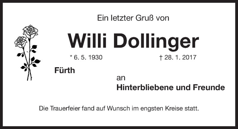 Hier finden Sie alle Traueranzeigen aus der Zeitung, die bisher für Willi Dollinger erschienen sind. Weitere Traueranzeigen, die in der Zeitung erscheinen, werden hier ebenfalls aufgelistet