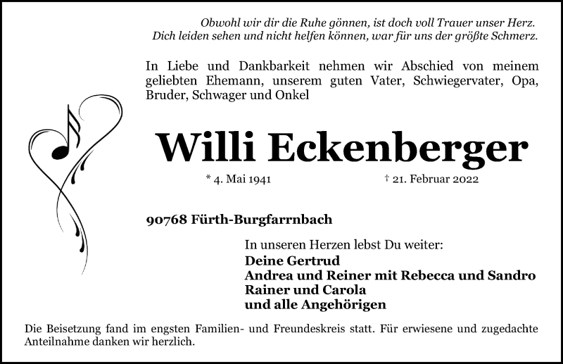 Hier finden Sie alle Traueranzeigen aus der Zeitung, die bisher für Willi Eckenberger erschienen sind. Weitere Traueranzeigen, die in der Zeitung erscheinen, werden hier ebenfalls aufgelistet