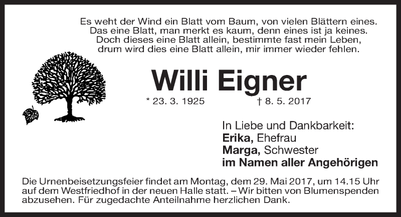 Hier finden Sie alle Traueranzeigen aus der Zeitung, die bisher für Willi Eigner erschienen sind. Weitere Traueranzeigen, die in der Zeitung erscheinen, werden hier ebenfalls aufgelistet