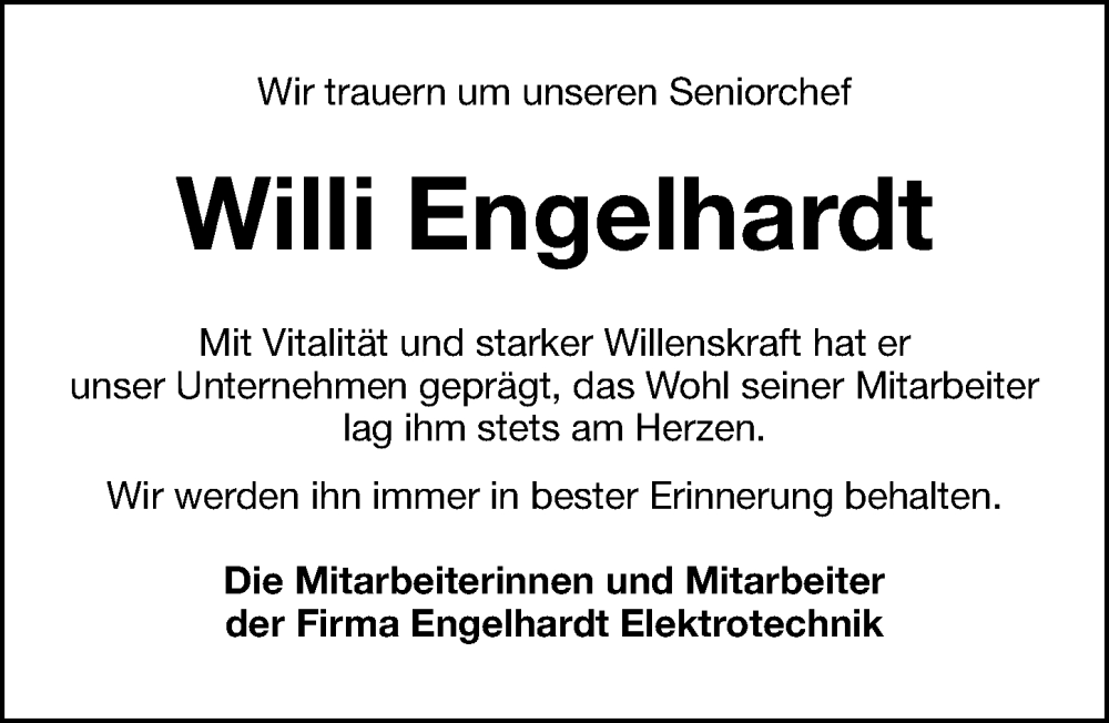 Hier finden Sie alle Traueranzeigen aus der Zeitung, die bisher für Willi Engelhardt erschienen sind. Weitere Traueranzeigen, die in der Zeitung erscheinen, werden hier ebenfalls aufgelistet
