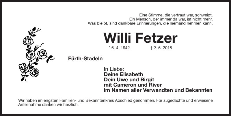 Hier finden Sie alle Traueranzeigen aus der Zeitung, die bisher für Willi Fetzer erschienen sind. Weitere Traueranzeigen, die in der Zeitung erscheinen, werden hier ebenfalls aufgelistet