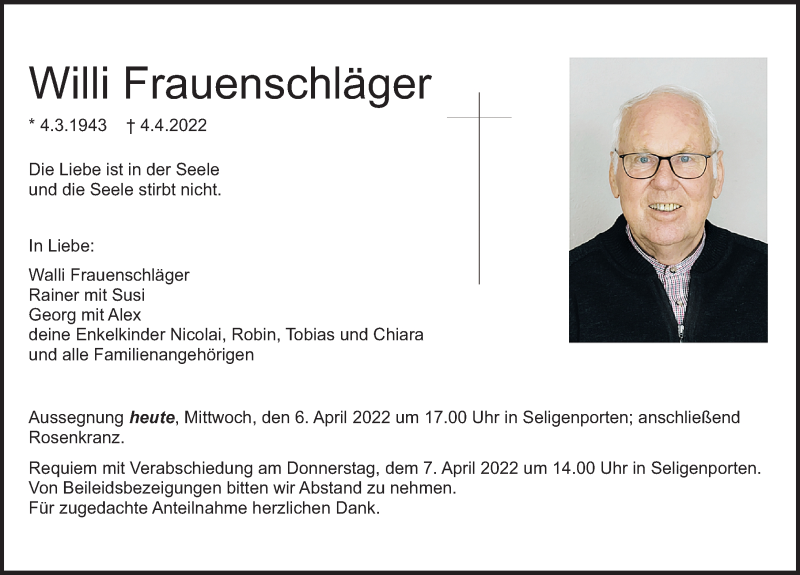 Hier finden Sie alle Traueranzeigen aus der Zeitung, die bisher für Willi Frauenschläger erschienen sind. Weitere Traueranzeigen, die in der Zeitung erscheinen, werden hier ebenfalls aufgelistet