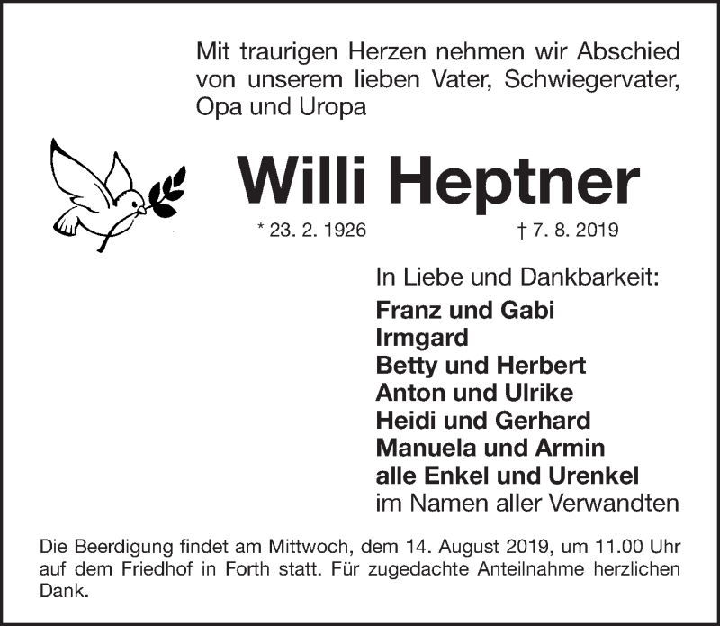 Hier finden Sie alle Traueranzeigen aus der Zeitung, die bisher für Willi Heptner erschienen sind. Weitere Traueranzeigen, die in der Zeitung erscheinen, werden hier ebenfalls aufgelistet