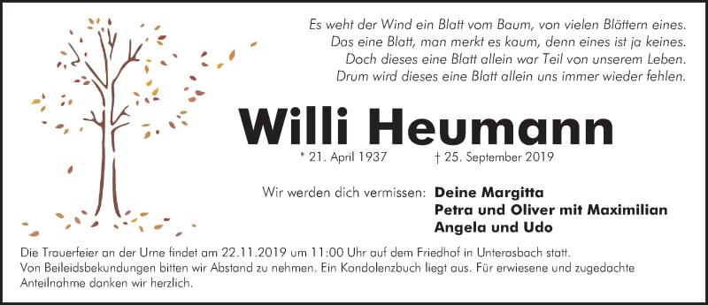 Hier finden Sie alle Traueranzeigen aus der Zeitung, die bisher für Willi Heumann erschienen sind. Weitere Traueranzeigen, die in der Zeitung erscheinen, werden hier ebenfalls aufgelistet