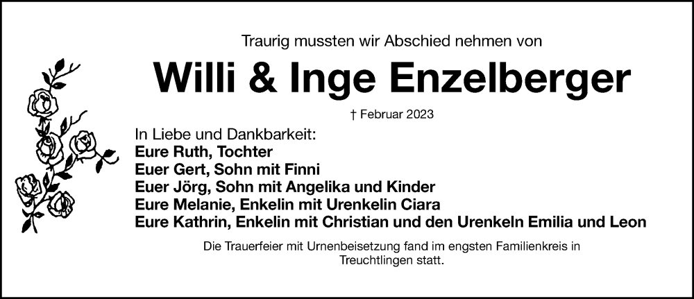 Hier finden Sie alle Traueranzeigen aus der Zeitung, die bisher für Willi Inge Enzelberger erschienen sind. Weitere Traueranzeigen, die in der Zeitung erscheinen, werden hier ebenfalls aufgelistet