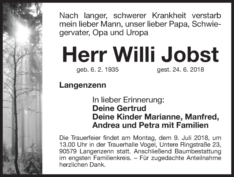 Hier finden Sie alle Traueranzeigen aus der Zeitung, die bisher für Willi Jobst erschienen sind. Weitere Traueranzeigen, die in der Zeitung erscheinen, werden hier ebenfalls aufgelistet