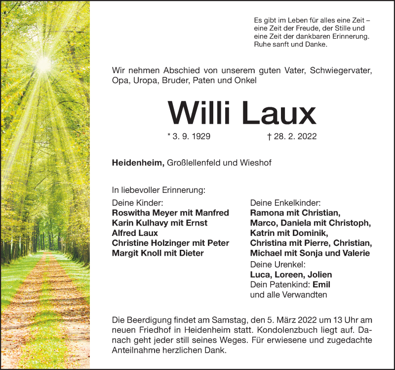 Hier finden Sie alle Traueranzeigen aus der Zeitung, die bisher für Willi Laux erschienen sind. Weitere Traueranzeigen, die in der Zeitung erscheinen, werden hier ebenfalls aufgelistet