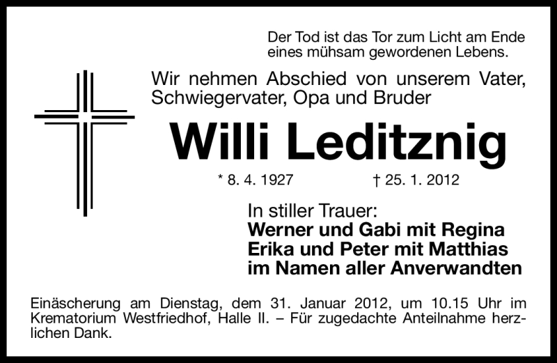Hier finden Sie alle Traueranzeigen aus der Zeitung, die bisher für Willi Leditznig erschienen sind. Weitere Traueranzeigen, die in der Zeitung erscheinen, werden hier ebenfalls aufgelistet