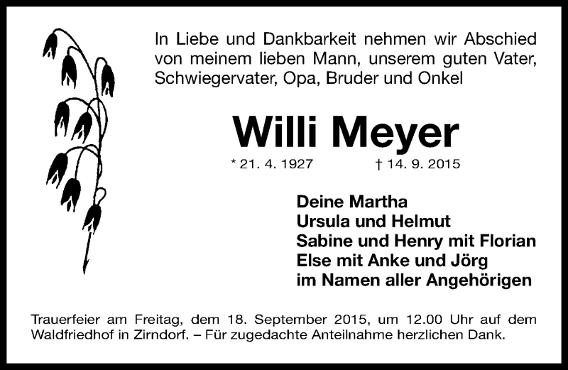 Hier finden Sie alle Traueranzeigen aus der Zeitung, die bisher für Willi Meyer erschienen sind. Weitere Traueranzeigen, die in der Zeitung erscheinen, werden hier ebenfalls aufgelistet