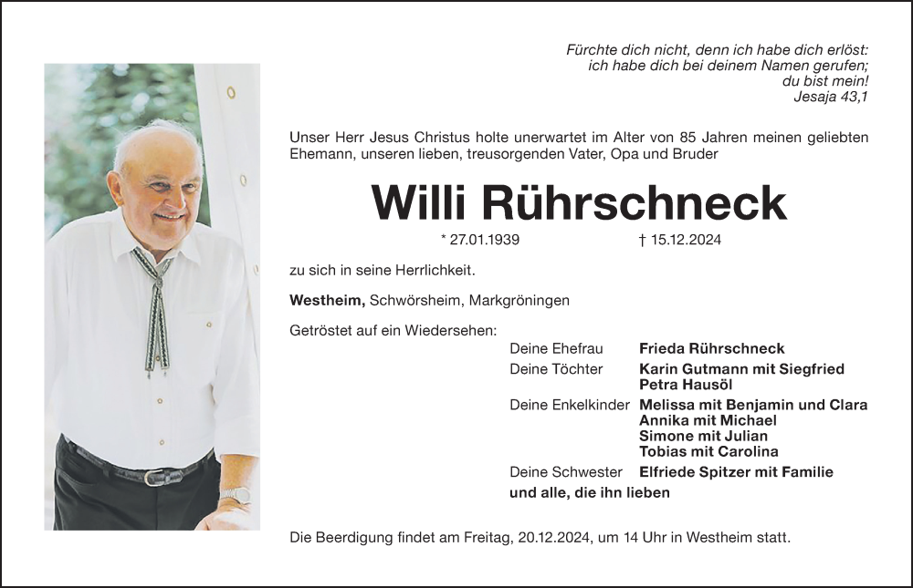 Hier finden Sie alle Traueranzeigen aus der Zeitung, die bisher für Willi Rührschneck erschienen sind. Weitere Traueranzeigen, die in der Zeitung erscheinen, werden hier ebenfalls aufgelistet